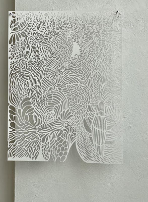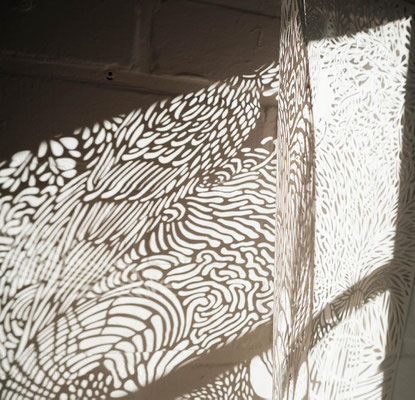 Im Rahmen der Ausstellung, die Papier nicht nur als Träger von Schrift und Bild, sondern als eigenständigen Werkstoff in all seiner sinnlichen, leichten, starken und zugleich zarten Qualität präsentierte, zeigte ich einen filigranen Papierschnitt: ornamental abstrahierte Motive sind aus dem Papier geschnitten, inspiriert von pflanzlichen und biomorphen Strukturen. Das Spiel von Licht und Schatten im Raum und auf der Wand ist integraler Bestandteil der Arbeit und erweitert die Wirkung der Arbeit in den Raum.