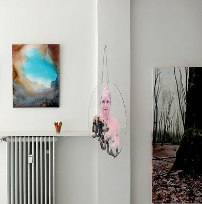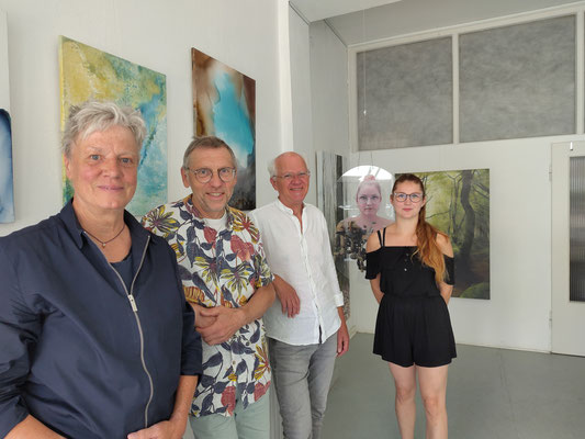 oben links: Tamara Reich, Jutta-Juri Börger, Petra Timmas vor Arbeiten von Tamara Reich, oben Mitte: floating fraktal, im Vordergrund eine Papierskulptur von Jutta-Juri Börger, unten links: Lagoon, unten Mitte: azure divide, rechts daneben Arbeiten von Tamara Reich, unten rechts: Collage von Imke Brunzema
