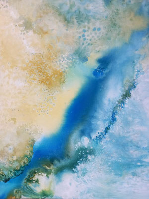 In der Serie Floating Fraktal erforsche ich das Zusammenspiel von spontaner Bewegung und bewusster Intervention. Ultraleicht fließende Tuschen breiten sich auf weißen Leinwänden aus und formen durch ihre Begegnung filigrane Fraktale. Sanfte Farbverläufe entfalten eine leuchtende Intensität, während gemalte Strukturen an biomorphe Muster erinnern. Im Zusammenspiel dieser Elemente entstehen visuelle Welten, die in unbekannte Räume führen.
